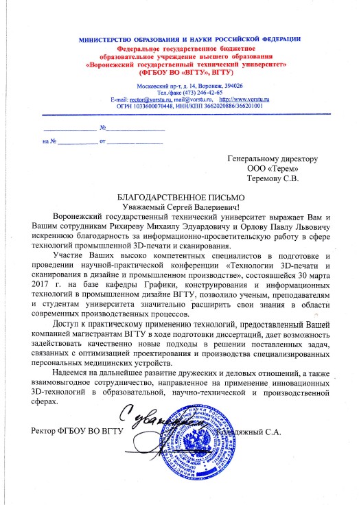 «Воронежский государственный технический университет» (ФГБОУ ВО «ВГТУ») направил в адрес компании ТЕРЕМ письмо, в котором выразил искреннюю благодарность за информационно-просветительскую работу в сфере технологий промышленной 3D-печати и сканирования.
